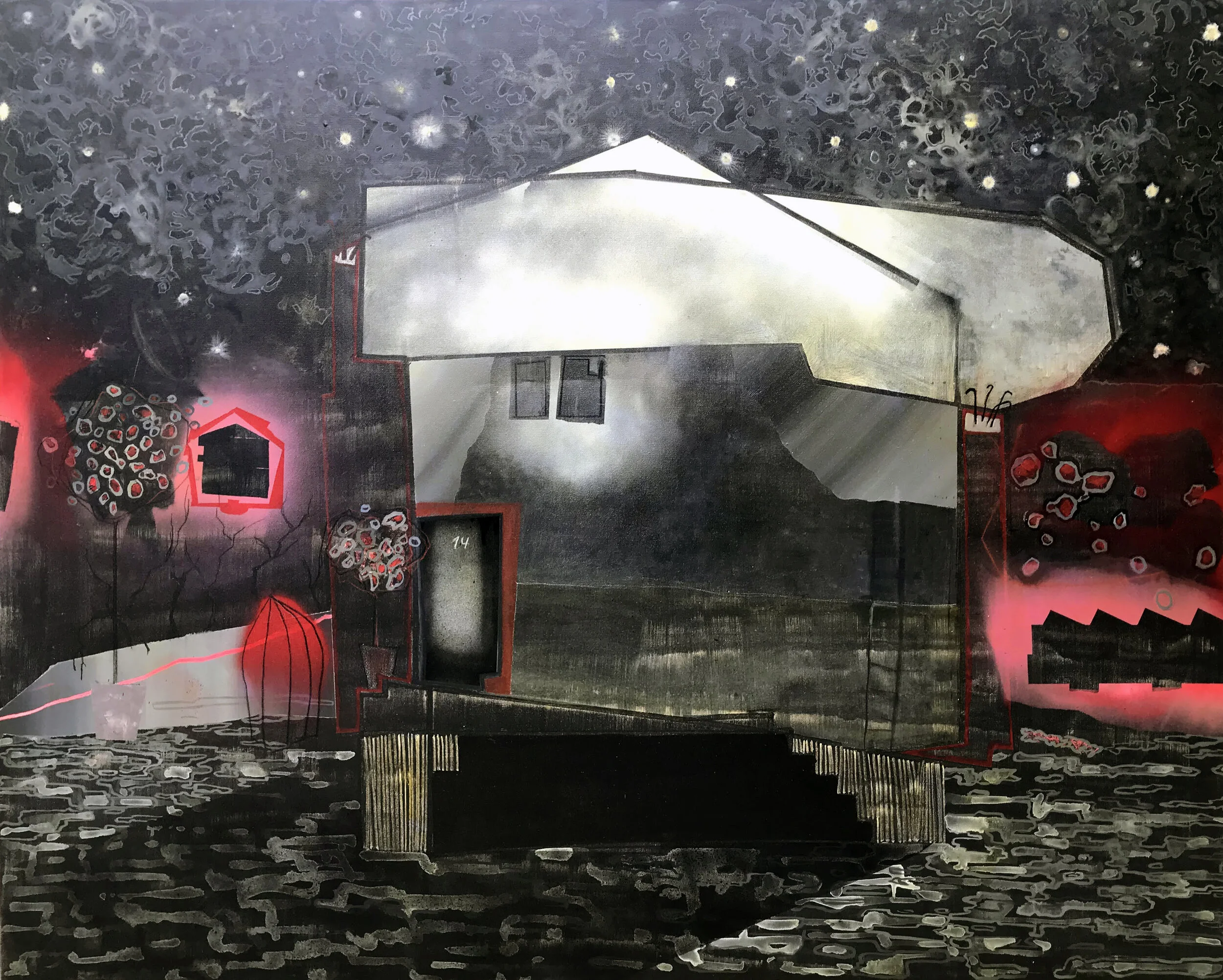 This painting id from a series that explores the concept of home and place, a sort of genius loci, deconstructed in memory and reconstructed on canvas and assuming a form where drawing meets painting.